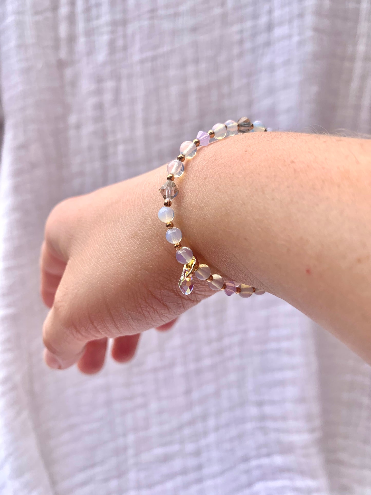 Please welcome the Dewdrop Fairy to the stage! This stretch bracelet is inspired by the role of Dewdrop from The Nutcracker Ballet. Hailing from the Land of Sweets, this piece features round opalite beads, reminiscent of drops of dew. Sprinkled between are lilac and cantaloupe crystals, and finally the sparkly teardrop bead attached.
